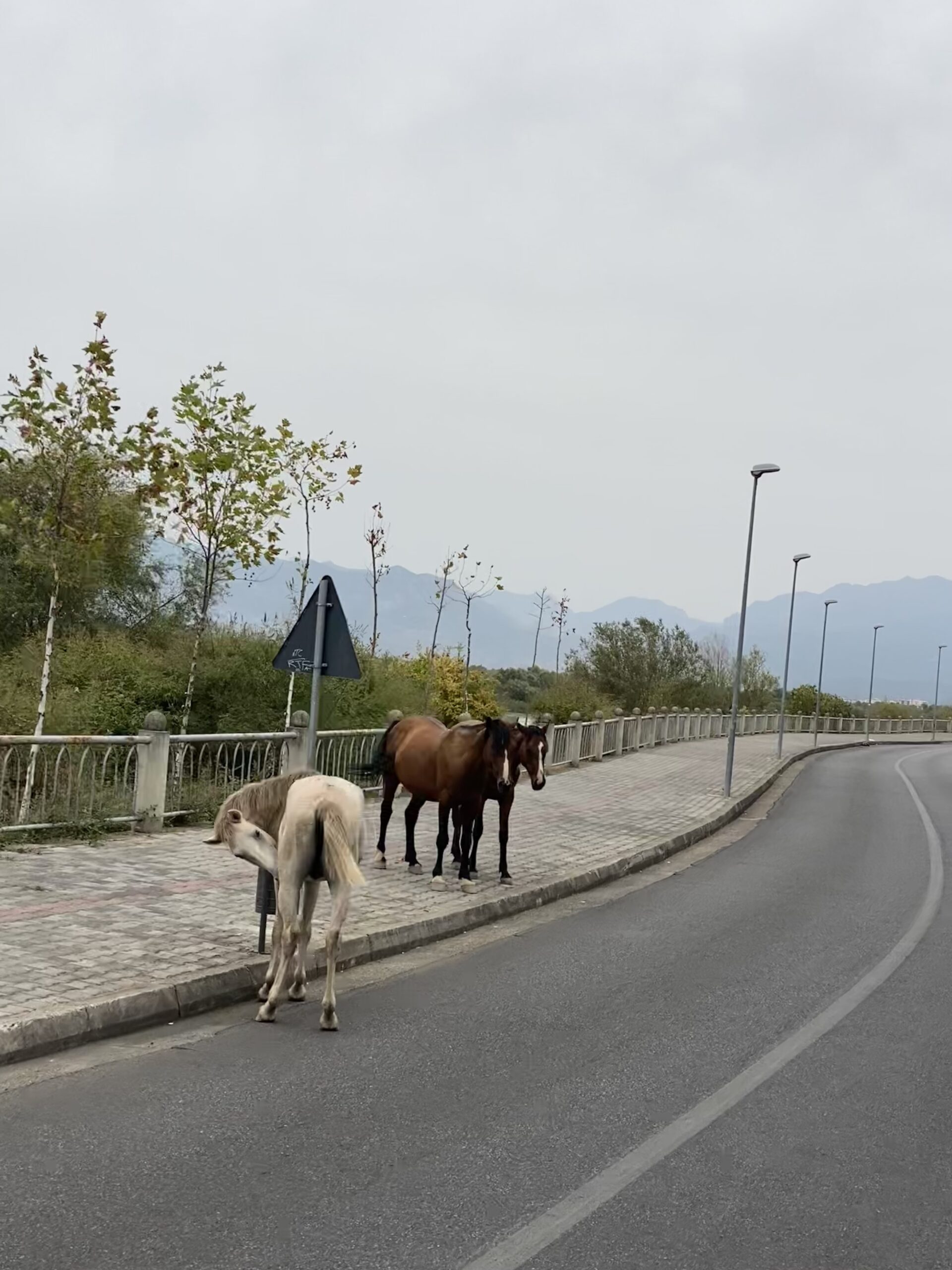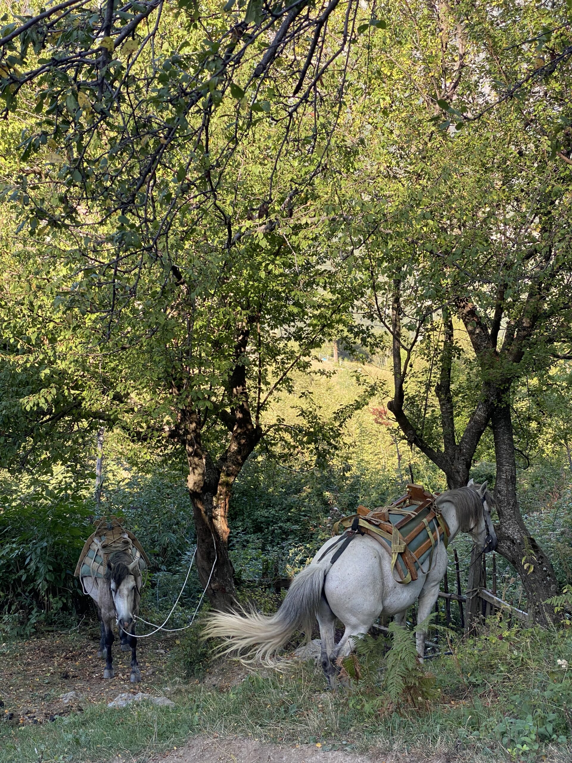 Shirokan luonnonpuisto oli pettymys. Lietteen hajua kaikkialla. Villihevosia näkyi taas roskalaatikoiden lähellä. Hiffasin, että hevoset eivät ole karanneita vaan villejä, kun todistimme irtohevosia jo keskellä ei mitään Thethin kansallispuiston teillä (sielläkin roskalaatikoiden kimpussa). Meillä oli ylikypsiä päärynöitä. Otin ne pussista pois ja kaadoin maahan hevosille.