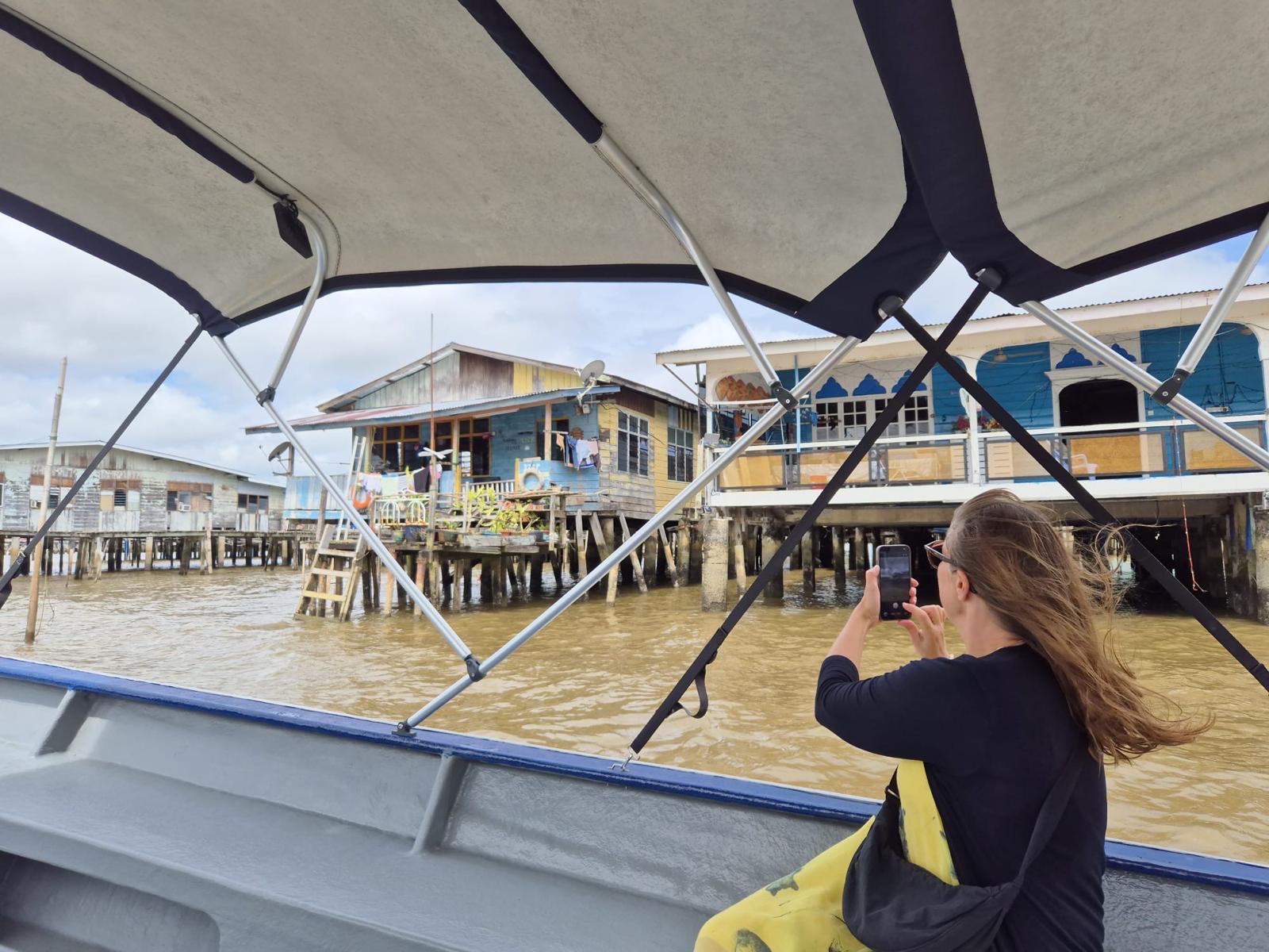 Kelluvaan kylään otimme dollarin veneen. Kampung Ayerin, Brunein kelluvan, paaluille rakennetun kylän , sanotaan olevan 30 000 asukkaallaan maailman suurin kelluva kylä. Toki sinne menee myös silta, mutta ns. väärältä puolelta kaupunkia. Rakennuksia on yli 4000.