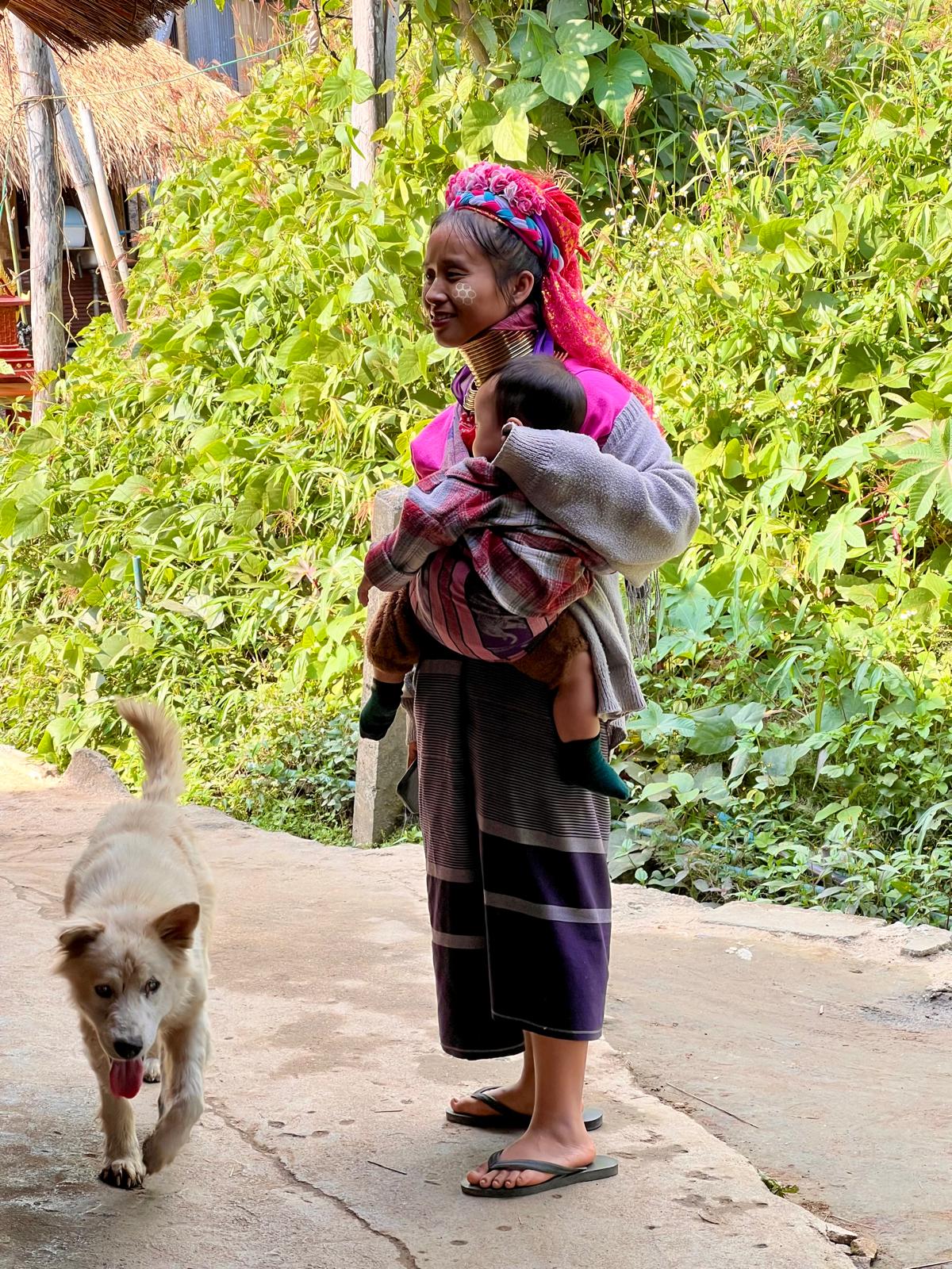 Pitkäkaulaisten naisten kylässä ei ollut muita turisteja meidän lisäksi, joten ehdimme oikeasti tutustua heihin. Rajoitetulla kielellä selvisi, että heimon uusin jäsen, vastasyntynyt vauva oli 12 päivää vanha!!!