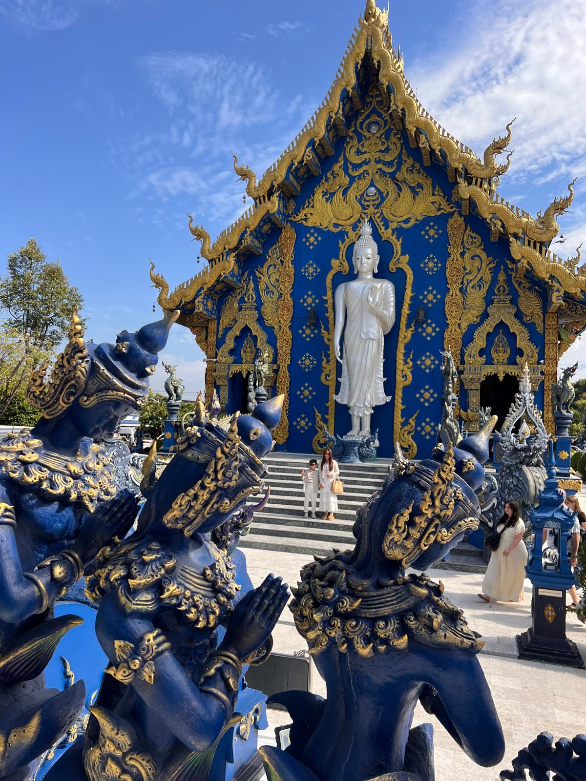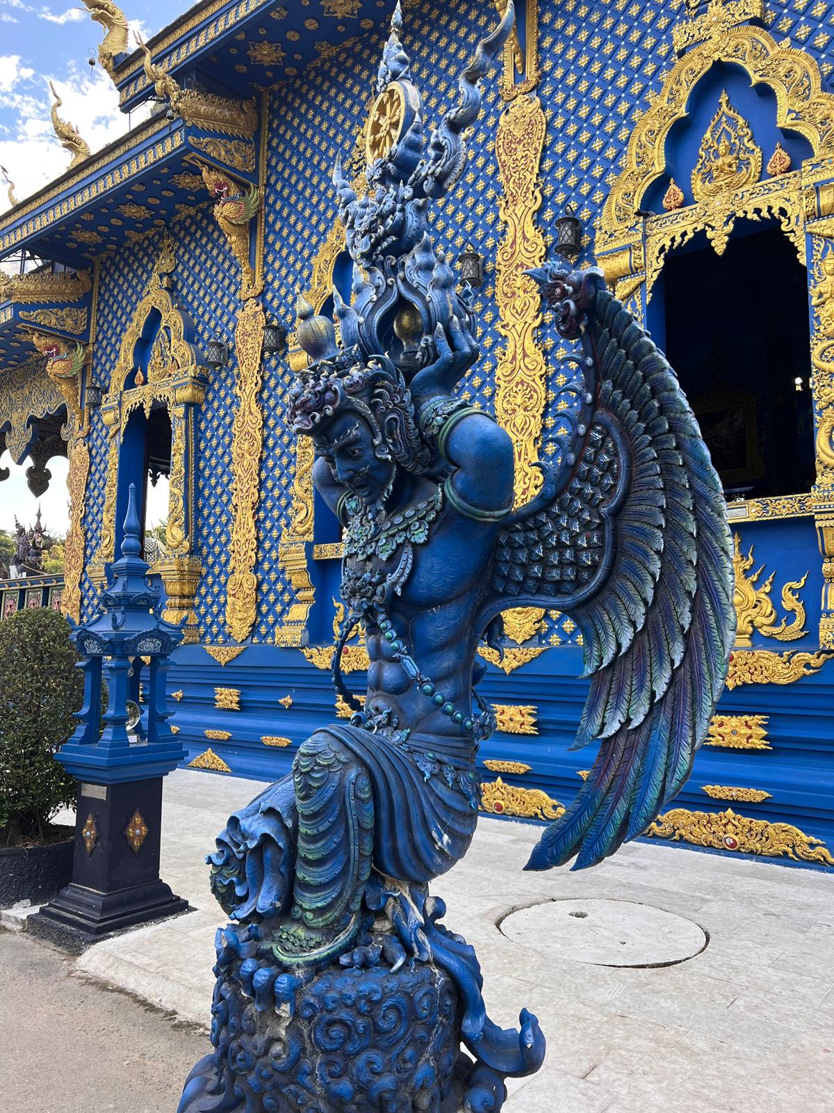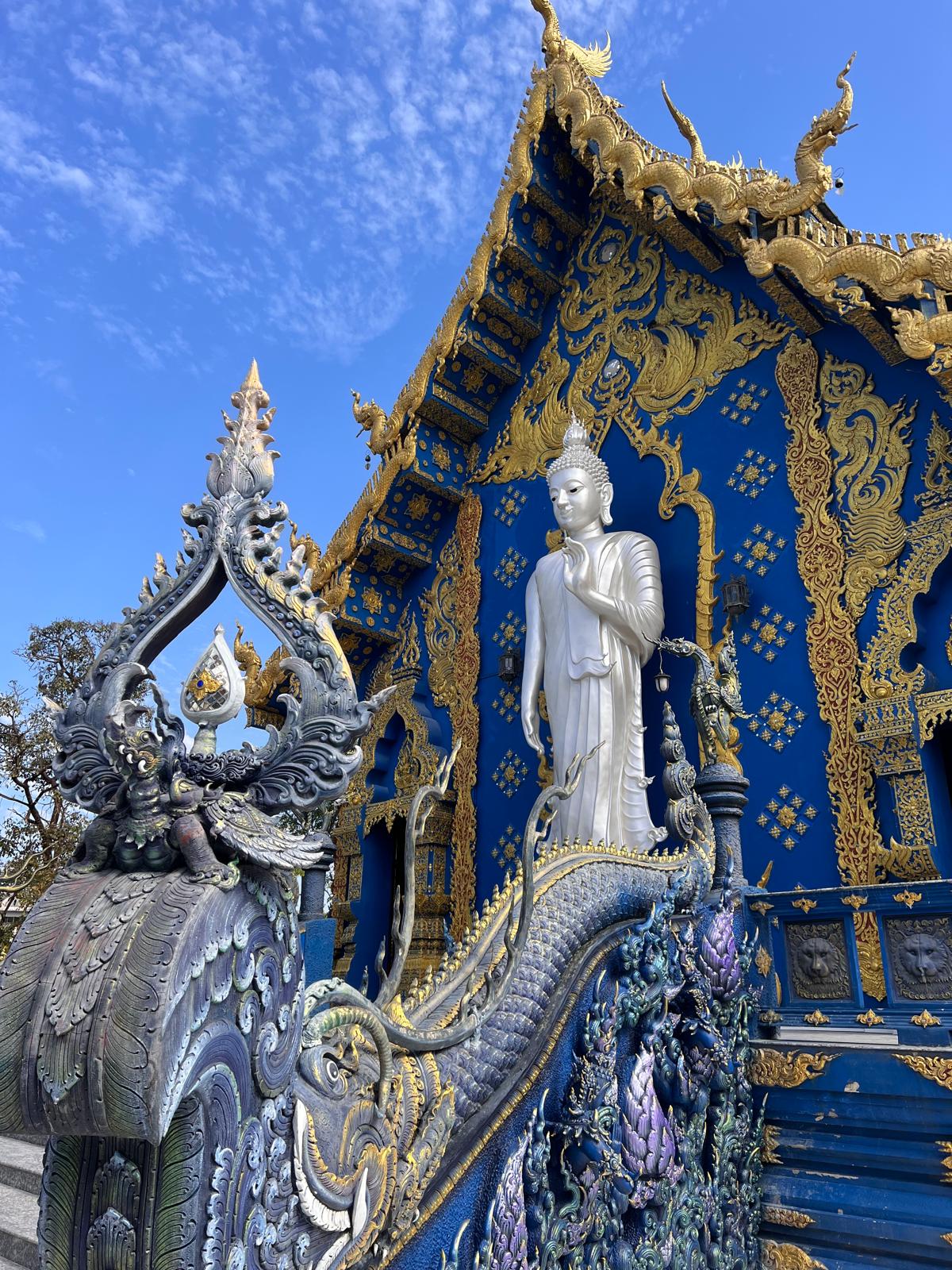 Sininen temppeli, Rong Suea Ten Temple , on myös todella tuore, rakennettu 2005. Jos tätä ei olisi opas kertonut, en olisi aavistanut. Sinisen temppelin suunnitteli valkoisen temppelin suunnittelijan oppilas. Temppeli on rakennutettu ihmisten lahjoitusrahoilla. Päätemppelin sisällä Buddhan elämän historiaa kuvattu. Ilmainen, päinvastoin kun noin vitosen(2025) maksava valkoinen.