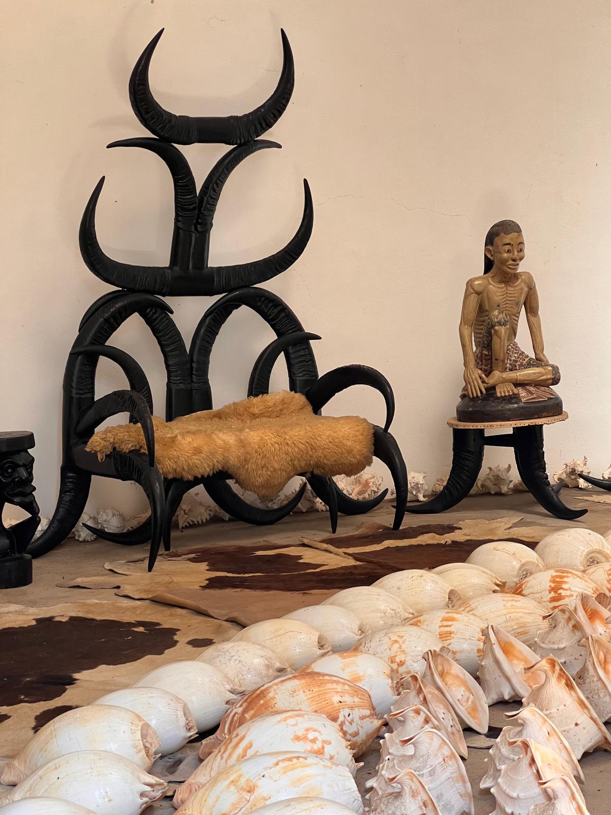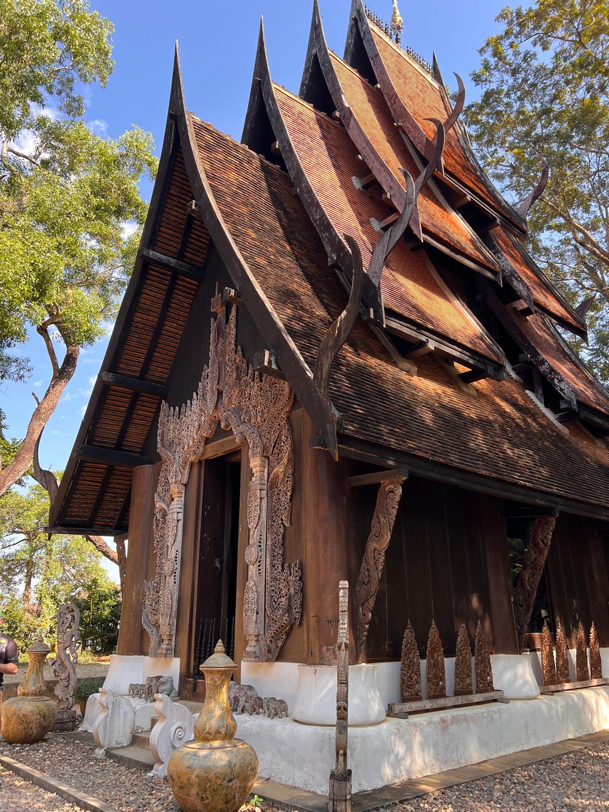 Kävimme päivän aikana kahdessa museossa. Chiang Raista noin kymmenkunta kilometriä pohjoiseen sijaitsee musta museotalo, Baan Dam. Museon perustanut taiteitelija on opiskellut Hollannissa ja Bangkokissa. Arkkitehtuurissaan hän on yhdistellyt Laosin, Myanmarin ja Thaimaan tyylejä. 80 THB (2,3€) Kaikkea löytyy krokotiilistä, käärmeestä ja buffalosta.