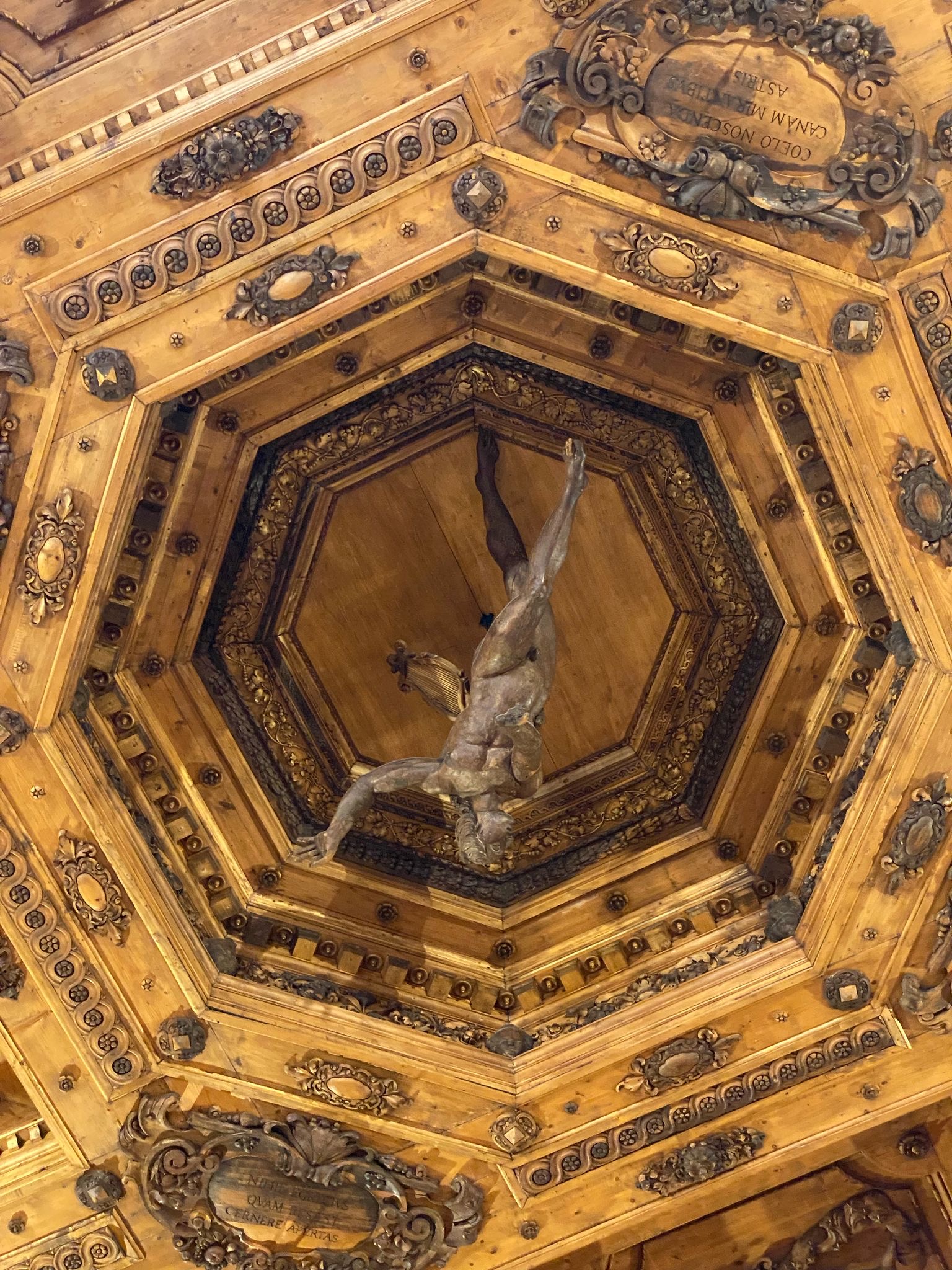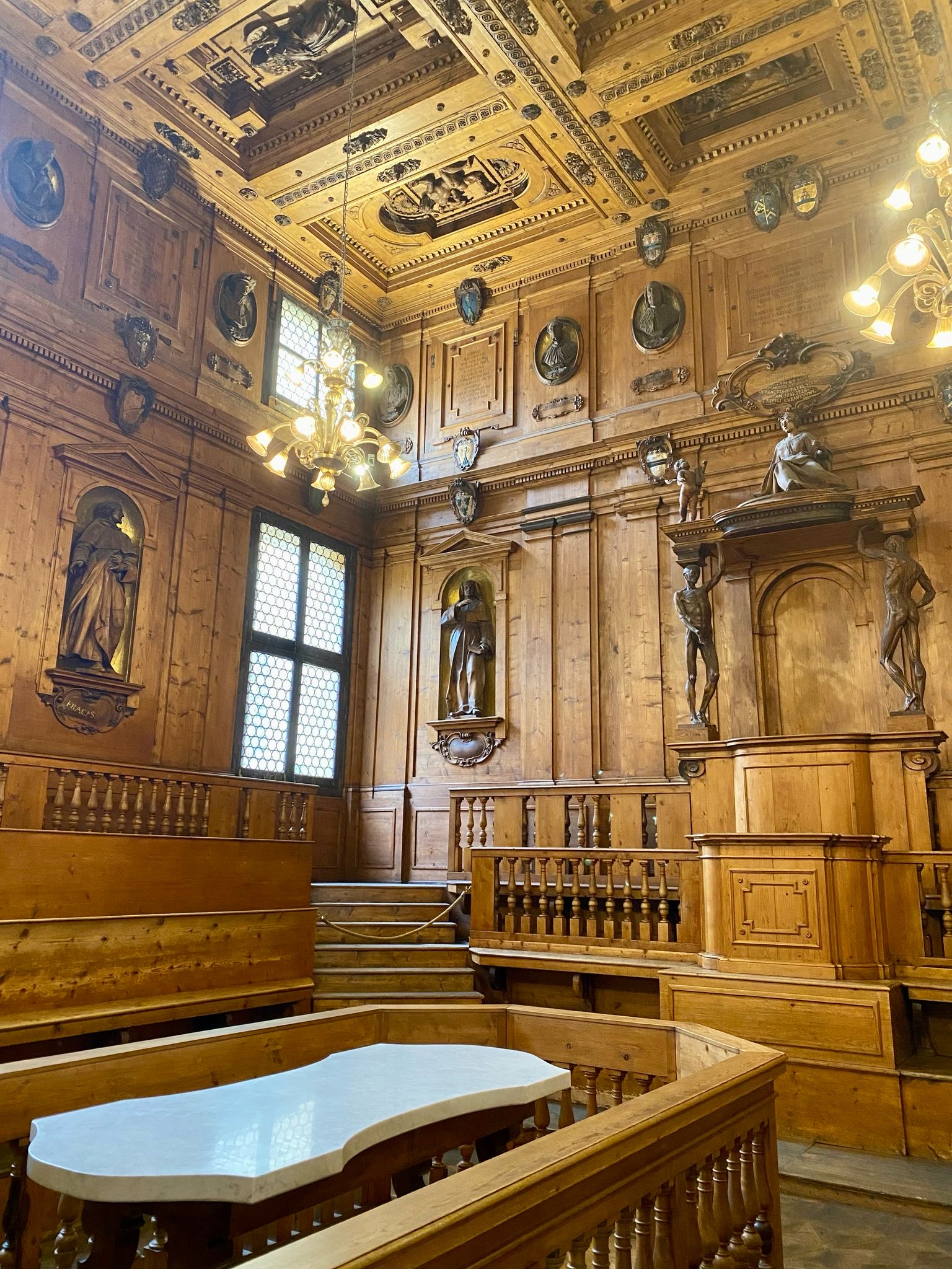 Leikkaussalihuone ei ole suuren suuri, mutta jokainen kohta on upea. Puupaneloidut seinät ja veistokset lääketieteen merkkihenkilöistä sekä Apollo jumalasta. Kattoa myöten puuveistoksia.