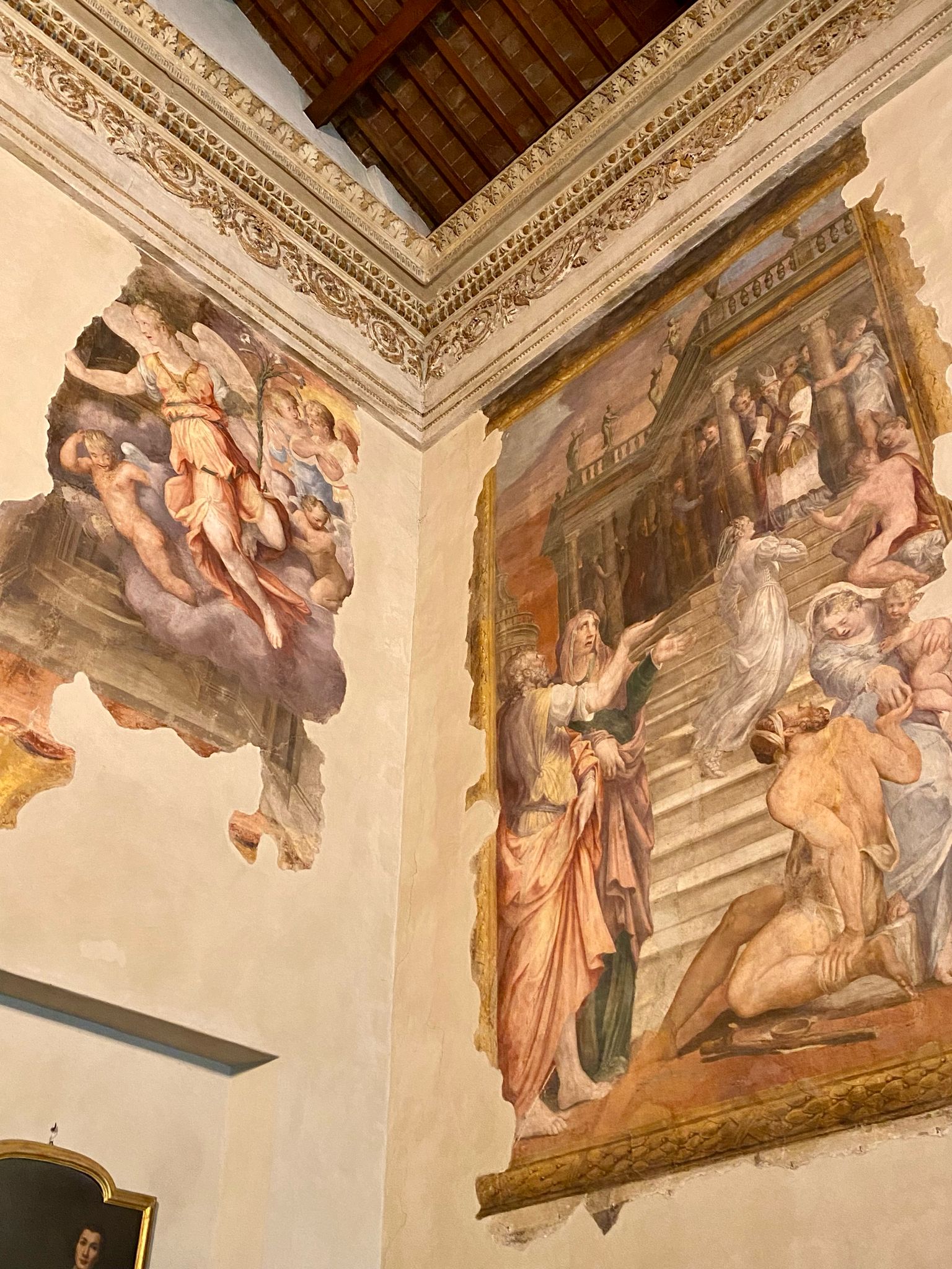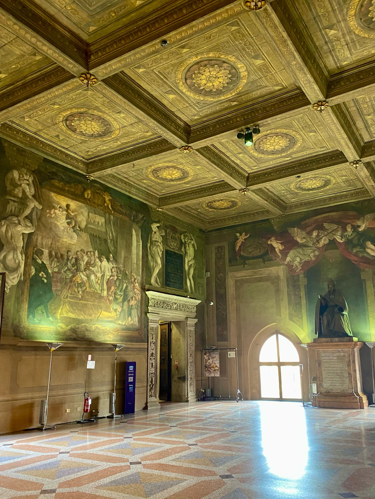 Palatseja Bolognassakin riittää. Palazzo D’Accursiossa pääsee näkemään Bolognan kaupunginvaltuuston upean salin. Käytävillä oli upeita maalauksia. Minulle ne riittivät, emme menneet itse palatsiin tai kiivenneet kellotorniin.