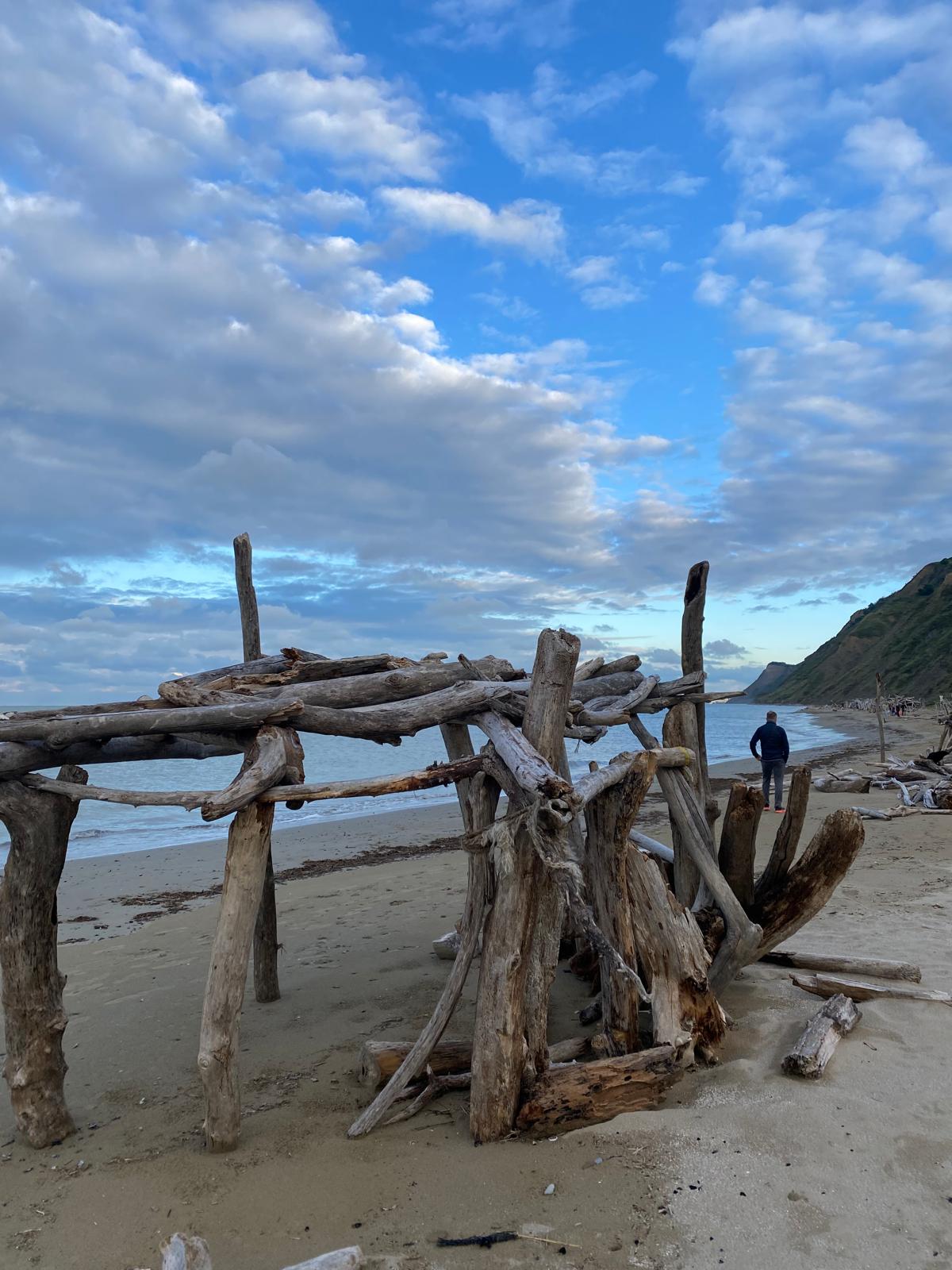 Alhaalla rannassa oli sitten ajautunut uppotukkeja satoja. Niistä oli tehty ”hippilaavuja”. Uskon, että kesäöinä alueella voi olla aikasmoisia bileitä.