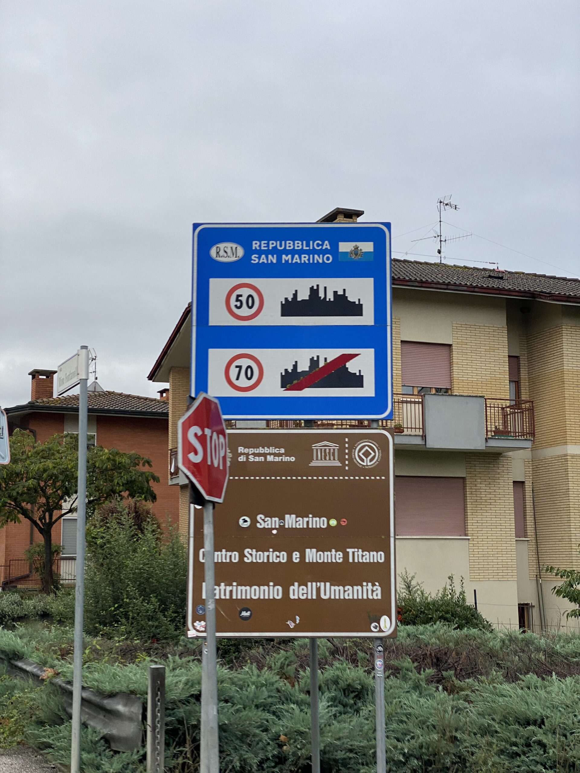 Ellei olisi kartasta katsonut milloin tulee maanraja, olisi voinut missata, pieni kyltti kertoo asian. Myöskään kieli ei vaihdu, italiaa San Marinossa puhutaan – ja yhtä vähän englantia kuin muuallakin Italiassa. Kaikkialla on hurjan siistiä. Ja organisoitua. Tiet hyviä.