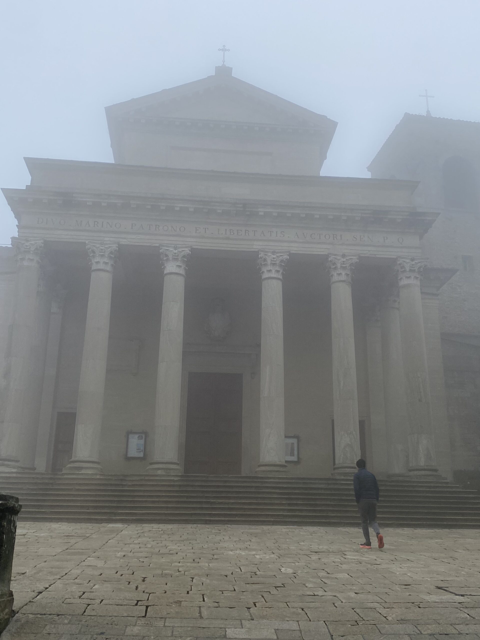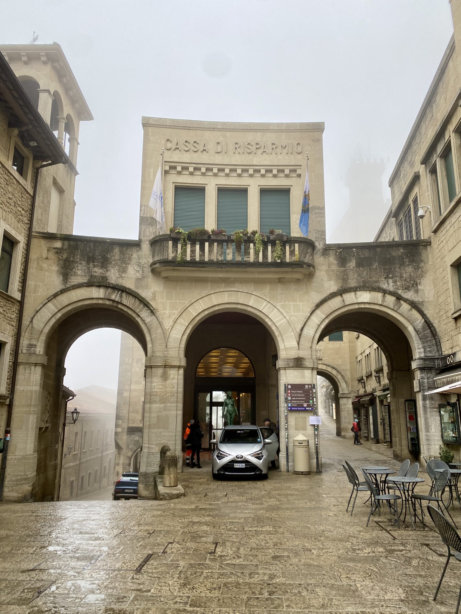 Ajamme Unescon maailmanperintölistattuun pääkaupunkiin, San Marinoon. Periaatteessa San Marinosta kukkulan päällä sijaitsevasta pääkaupungista, San Marinosta näkee kauas, Dalmatian rannikolle asti. Mutta vain periaatteessa, aamusumussa ei näe mihinkään.