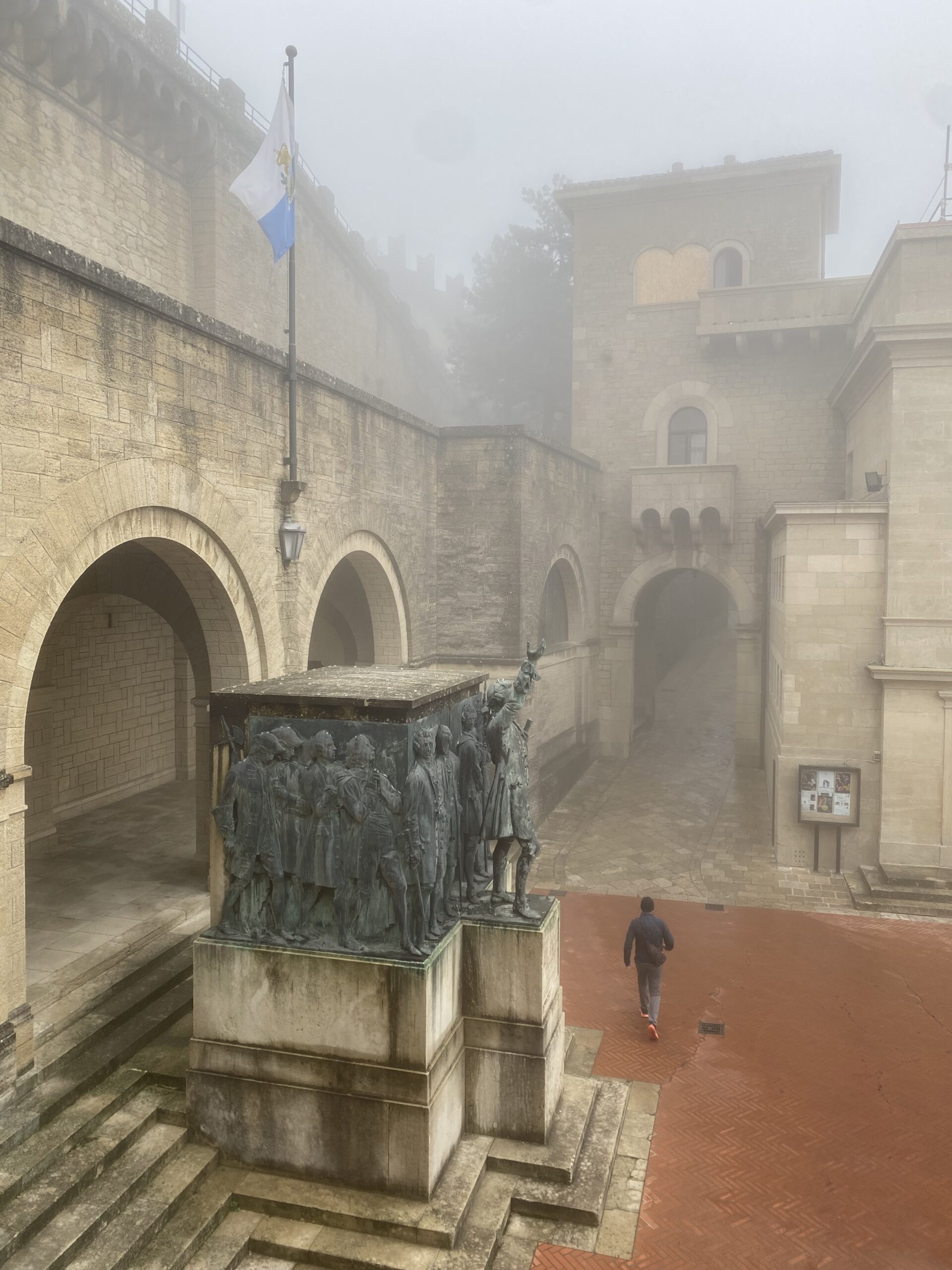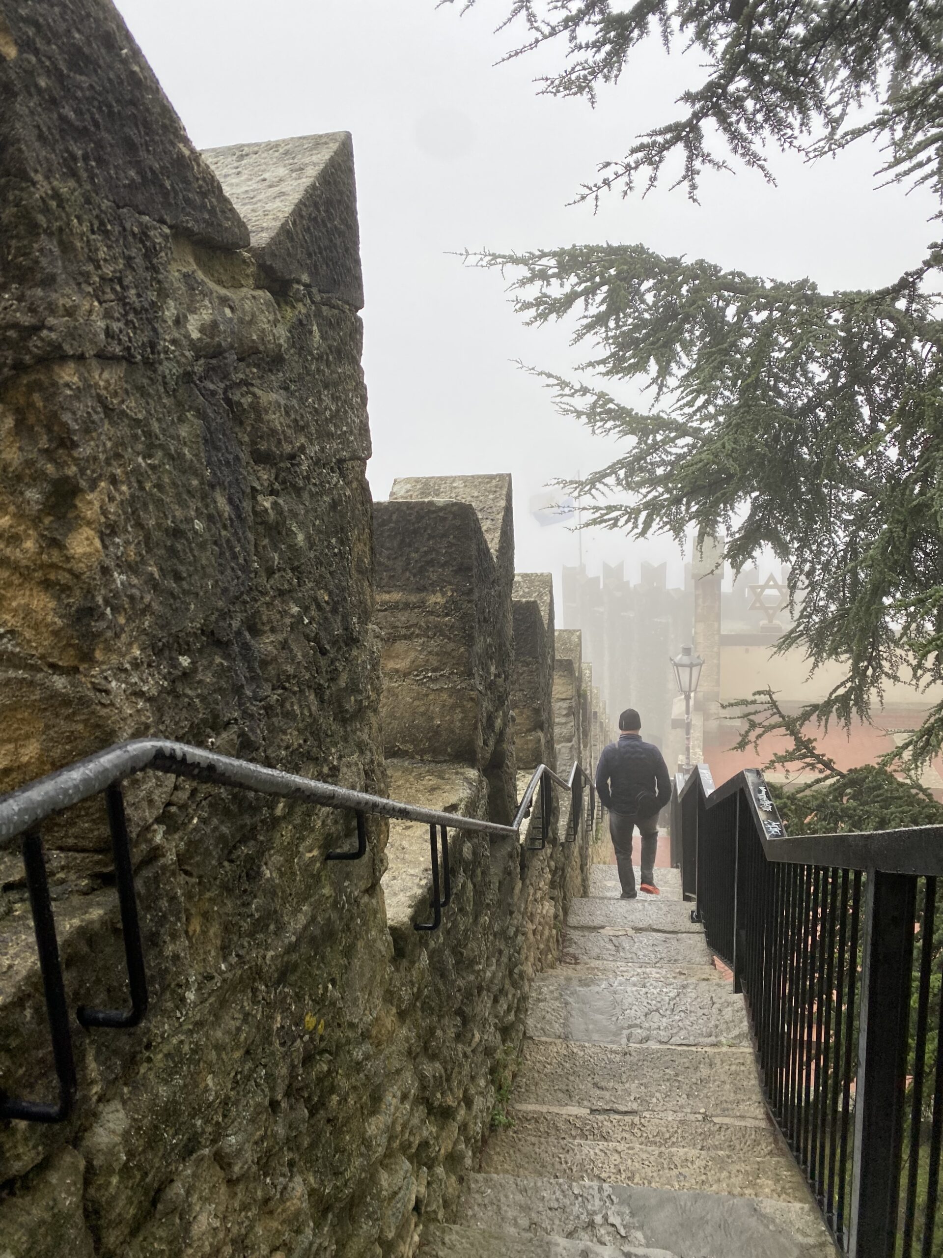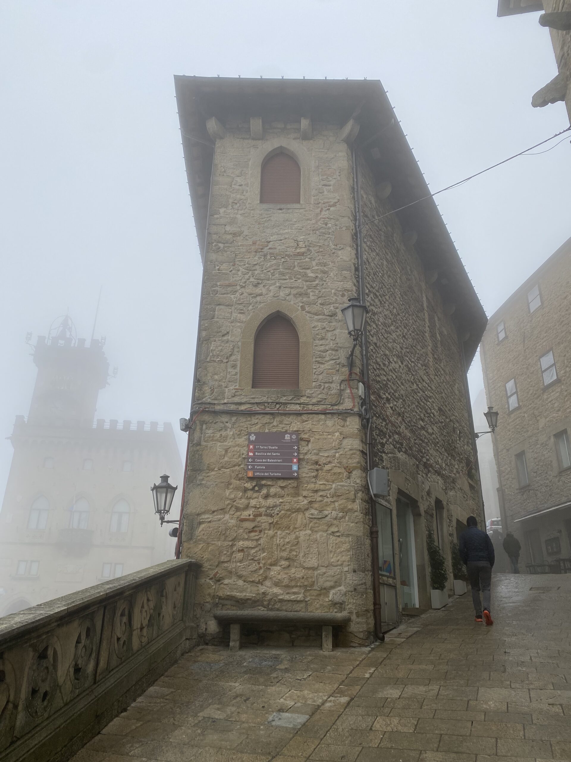 San Marinon maamerkkejö ovat sen kolme tornia: Guaita, Cesta ja Montale. Olin lukenut, että kannattaa kiivetä Cestalle, kun sieltä näkee parhaiten muille torneille. Ei harmittanut olla kaupungissa ennen aamuyhdeksää ja lipunmyynnin aukeamista. Näin sankassa sumussa ei olisi kannattanutkaan lippuhintaa maksaa. All trails apistä olin myös ladannut kahden tunnin vaellusreitin, jäi sekin välistä.