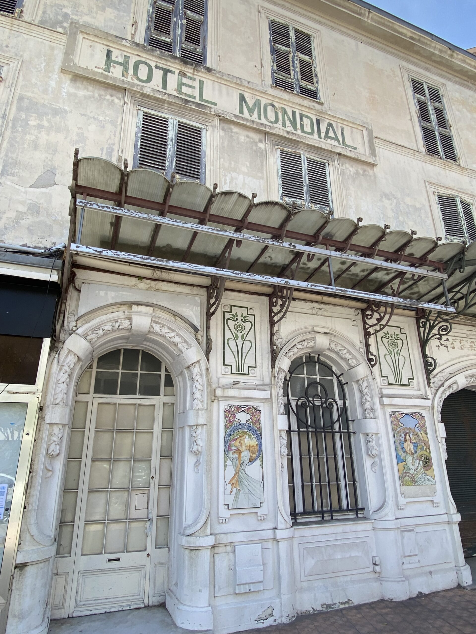 Minulle ei ihan auennut, miksi se Ventimiglia oli niin pelottava? Vaikutti sellaiselta, mistä itse olisin tykännyt. Piti oikein tarkistaa, ovatko Mentonin hotelli Mondialin seinässä olevat teokset Muchan, ja olivathan ne!